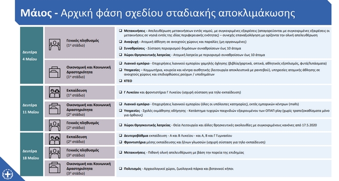 Όπως χαρακτηριστικά είπε ο κ. Σκέρτσος η αποκλιμάκωση των μέτρων κατά τον μήνα Μάιο διαρθρώνεται σε τρία στάδια, στις 4, στις 11 και στις 16 Μαΐου ενώ το πλάνο του Ιουνίου θα ανακοινωθεί αναλυτικά μετά τις 18 Μαΐου, όταν θα υπάρχει σαφής εικόνα των επιδημιολογικών δεδομένων.