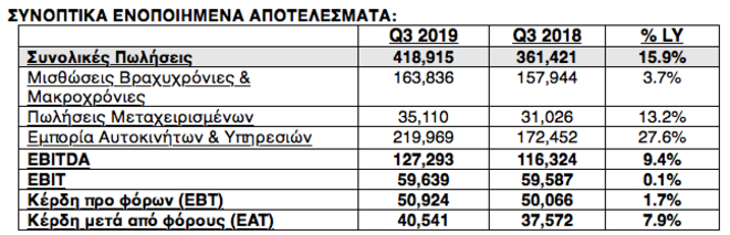 Στο εννεάμηνο του 2019 συνεχίστηκε η αναπτυξιακή πορεία των οικονομικών μεγεθών του Ομίλου AUTOHELLAS, με τον κύκλο εργασιών να φτάνει τα €418.9εκ., έναντι €361.4εκ. την αντίστοιχη περίοδο του 2018, καταγράφοντας αύξηση 15.9%. Κατά την ίδια περίοδο, τα κέρδη προ τόκων, φόρων και αποσβέσεων (ΕBITDA) διαμορφώθηκαν στα €127.3 εκ. σημειώνοντας αύξηση 9.4%.