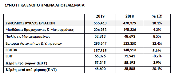 Η AUTOHELLAS ανακοίνωσε τα οικονομικά αποτελέσματα του Ομίλου για το έτος 2019, καταγράφοντας αύξηση 18,1% στον ενοποιημένο κύκλο εργασιών, ο οποίος ανήλθε σε €555,4εκ., έναντι €470,4εκ. το 2018. Κατά την ίδια περίοδο τα κέρδη προ φόρων, χρηματοδοτικών και επενδυτικών αποτελεσμάτων και αποσβέσεων (EBITDA) ανήλθαν στα € 157,3εκ., σημειώνοντας αύξηση 5,6%.