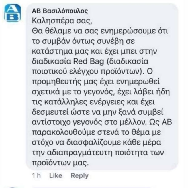 Σύμφωνα με την απάντηση λοιπόν της AB Βασιλόπουλος “το συμβάν όντως συνέβη σε κατάστημα μας και έχει μπει στην διαδικασία Red Bag (διαδικασία ποιοτικού ελέγχου προϊόντων). Ο προμηθευτής μας έχει ενημερωθεί σχετικά με το γεγονός, έχει λάβει ήδη τις κατάλληλες ενέργειες και έχει δεσμευτεί ώστε να μην ξανασυμβεί αντίστοιχο γεγονός στο μέλλον. Ως ΑΒ παρακολουθούμε στενά το θέμα με στόχο να διασφαλίζουμε κάθε μέρα την αδιαπραγμάτευτη ποιότητα των προϊόντων μας“.