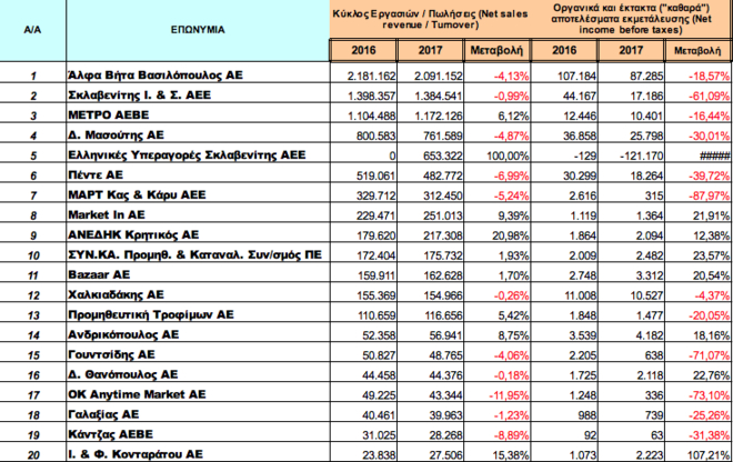 Στην εξέλιξη και των δύο βασικών οικονομικών μεγεθών, συνετέλεσε σημαντικά ο όμιλος Σκλαβενίτης, στη μεν αύξηση των πωλήσεων με τη σταδιακή επαναλειτουργία του πρώην δικτύου Μαρινόπουλος, στη δε μείωση της κερδοφορίας με την αρνητική επίδοση της Ελληνικές Υπεραγορές Σκλαβενίτη (από κέρδη 55,50 εκατ. ευρώ το 2016, σημείωσε το 2017 ζημιές ύψους 109,80 εκατ. ευρώ).