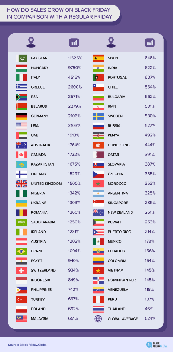 Μέσα στην πρώτη πεντάδα η Ελλάδα σε ό,τι αφορά το ποσοστό αύξησης των πωλήσεων την Black Friday σε σχέση με τον μέσο όρο των υπόλοιπων Παρασκευών.