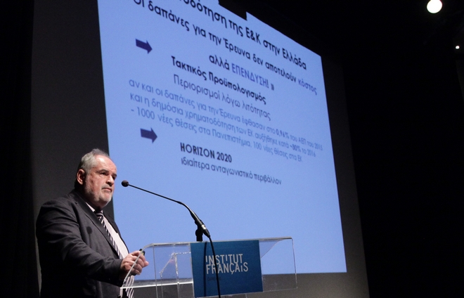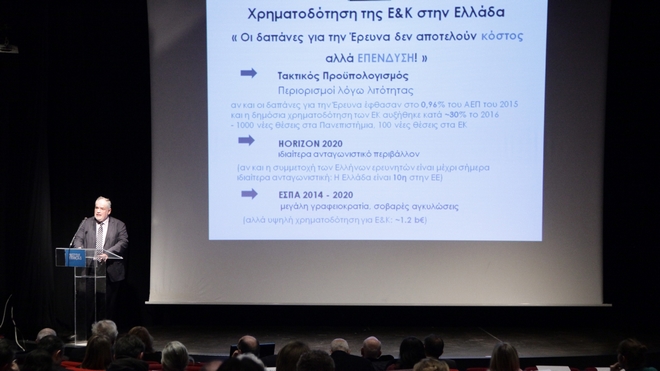 “Οι δαπάνες για την έρευνα και την καινοτομία, δεν είναι κόστος, αλλά επένδυση για το μέλλον. Οι προβλεπόμενες δαπάνες για την έρευνα ανέρχονται κοντά στο 1% του ΑΕΠ, 200 εκατομμύρια πάνω από τα σχετικά χρήματα που είχαν διατεθεί το 2014”.