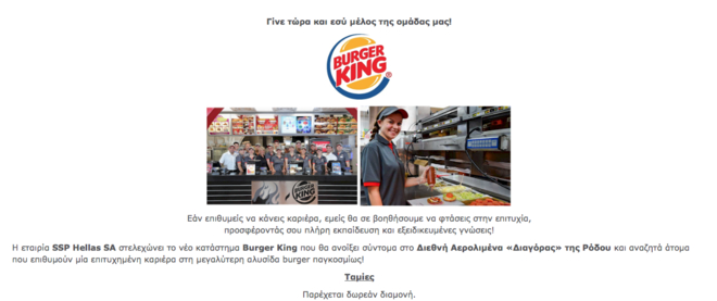 Το πρώτο Burger King στην Ελλάδα είναι πλέον γεγονός καθώς οι κατασκευαστικές εργασίες είναι σε προχωρημένο στάδιο και η εταιρεία SSP η οποία φέρνει την αμερικανική αλυσίδα στην χώρα μας έχει αναρτήσει αγγελίες για την πρόσληψη προσωπικού που θα στελεχώσουν το πρώτο κατάστημα το οποίο θα βρίσκεται στο αεροδρόμιο Διαγόρας της Ρόδου.