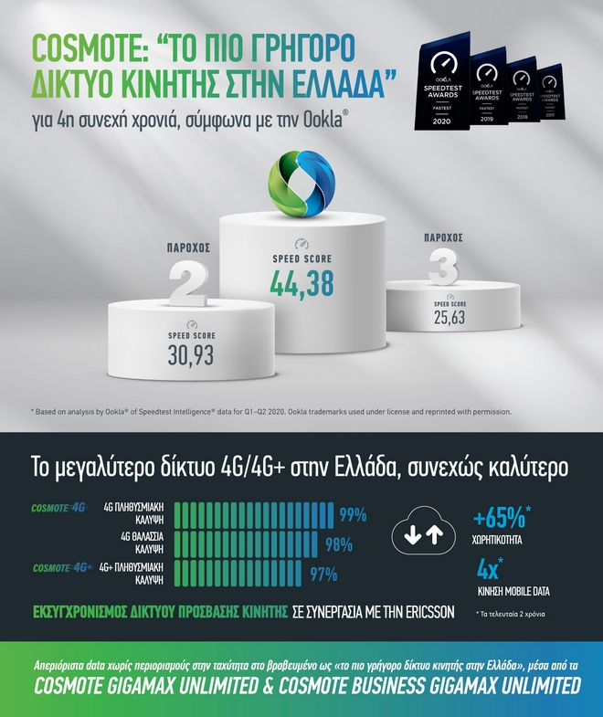 Τα Speedtest AwardsTM, του ανεξάρτητου φορέα Ookla®, ανέδειξαν νικήτρια την COSMOTE για τέταρτη συνεχόμενη χρονιά. Σύμφωνα με την πρώτη εταιρεία παγκοσμίως για μετρήσεις broadband και mobile internet, το δίκτυο COSMOTE αναδείχθηκε ως «το πιο γρήγορο δίκτυο κινητής στην Ελλάδα» πετυχαίνοντας σκορ ταχύτητας (Speed ScoreTM) 44,38, πάνω από 40% υψηλότερο από εκείνο του δεύτερου παρόχου (2ος: 30,93 και 3ος: 25,63).