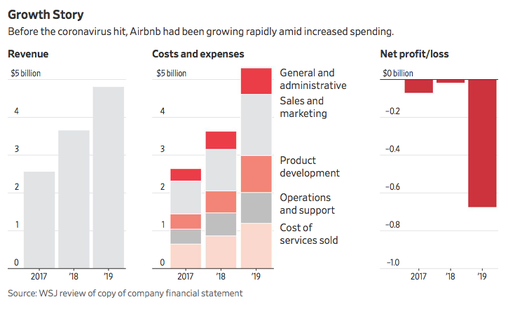Στο αβέβαιο μέλλον της AirBNB αναφέρθηκε και η Wall Street Journal πριν από λίγες ημέρες κάνοντας λόγο για “κάψιμο χρημάτων” την περίοδο του κορονοϊού στον τίτλο του θέματος της. Σύμφωνα με το δημοσίευμα, οι κρατήσεις γνωρίζουν κάθετη πτώση, εξαιτίας της πανδημίας, κυρίως στην αγορά της Αμερικής που είναι μακράν η μεγαλύτερη. Το πιο ανησυχητικό όμως είναι ότι η εταιρεία – όπως και πολλές άλλες που ξεκίνησαν από start ups – δεν μπορεί να περάσει σε κερδοφορία παρά την συνεχή αύξηση του κύκλου εργασιών της. Μάλιστα το 2019 δείχνει να είναι χρονιά ρεκόρ με τις ζημίες να ξεπερνούν τα 600 εκατ. δολάρια. Πολύ πιθανόν το 2020 να είναι η πιο κρίσιμη χρονιά της, καθώς και ο τζίρος της θα δεχτεί πλήγμα και τα αποτελέσματα της θα επηρεαστούν από τις παροχές που ήδη ξεκίνησε να καταβάλει.