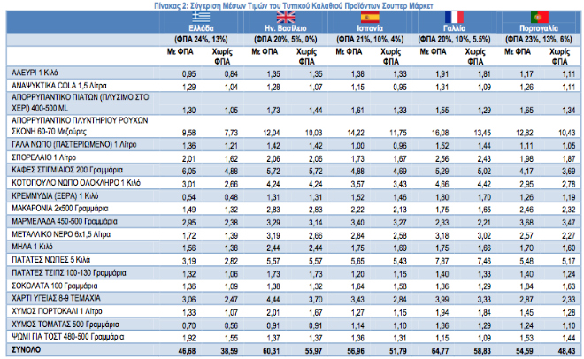 Η βασική διαφορά είναι ότι τρόφιμα που στην Ελλάδα υπάγονται στον υψηλό συντελεστή ΦΠΑ με 24% στις υπόλοιπες χώρες υπάγονται στον χαμηλό συντελεστή ΦΠΑ, ο οποίος είναι και χαμηλότερος του ελληνικού με 6%, 5,5%, 4% ή ακόμα και 0%. Σημειώνεται ότι η εισαγωγή ειδικών φόρων κατανάλωσης (π.χ. καφές) δεν είναι δυνατόν να συνυπολογιστεί στα παραπάνω στοιχεία. Το γενικό συμπέρασμα που προκύπτει από την παραπάνω ανάλυση είναι ότι το οργανωμένο ελληνικό λιανεμπόριο τροφίμων (σουπερμάρκετ) παρέχει στους Έλληνες καταναλωτές πρόσβαση σε προϊόντα για το τυπικό του καλάθι με κατά μέσο όρο σε πολύ χαμηλότερη τιμή (ακόμα και στα φθηνά προϊόντα των τυπικών 20 κατηγοριών), που είναι αποτέλεσμα της οργανωμένης προσπάθειας των προμηθευτών και των λιανεμπόρων για συγκράτηση των τιμών τα τελευταία χρόνια. Η τάση αυτή με μικρές διακυμάνσεις είναι διαχρονική την τελευταία 5ετία που πραγματοποιείται η συγκεκριμένη έρευνα από το ΙΕΛΚΑ.