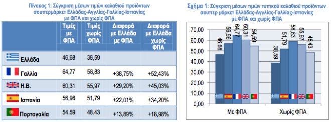 Η σύγκριση των μέσων τιμών των καλαθιών (πίνακας 1) δείχνει ότι και οι τέσσερις χώρες έχουν σημαντικά ακριβότερο μέσο καλάθι από την Ελλάδα, 22% η Ισπανία, 39% η Γαλλία, 29% η Αγγλία, 14% η Πορτογαλία. Η εικόνα των αποτελεσμάτων αλλάζει σημαντικά όταν αφαιρέσουμε τον αναλογούντα ΦΠΑ ανά χώρα για να γίνουν αντιληπτές τις πραγματικές τιμές των προϊόντων σουπερμάρκετ. Η σύγκριση των καλαθιών σε αυτή την περίπτωση (σχήμα 1) δείχνει ότι οι τέσσερις χώρες έχουν ακόμα πιο ακριβό μέσο καλάθι από την Ελλάδα, η Ισπανία κατά 33%, η Γαλλία κατά 52%, η Αγγλία κατά 45% και η Πορτογαλία κατά 19%. Αυτό είναι αποτέλεσμα της πολύ μεγάλης διαφοράς που έχει ο χαμηλός ΦΠΑ ανά χώρα (πρόκειται για τον ΦΠΑ που αναφέρεται σε τρόφιμα και ποτά). Στην Ελλάδα αυτός ο ΦΠΑ τον Ιούλιο 2017 είναι 13% και 24% για συγκεκριμένες κατηγορίες προϊόντων, κάποιες από τις οποίες συμμετέχουν στο δείγμα της έρευνας, όπως είναι τα έλαια, ο καφές, τα γλυκά, τα σνακς και τα αρτοποιήματα. Ο ΦΠΑ είναι σημαντικά υψηλότερος από την Αγγλία(0%) και τη Γαλλία (10% και 5,5%), την Ισπανία (10% και 4%), την Πορτογαλία (13% και 6%), αλλά και τις περισσότερες χώρες της ΕΕ.