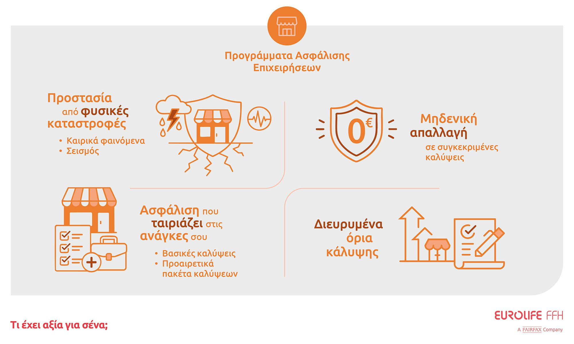 Η Eurolife FFH αναγνωρίζοντας την ανάγκη των σύγχρονων επιχειρήσεων για ουσιαστική υποστήριξη προσφέρει, εκτός από την ασφάλιση περιουσίας, ένα ολοκληρωμένο ασφαλιστικό πλαίσιο, και συγκεκριμένα: