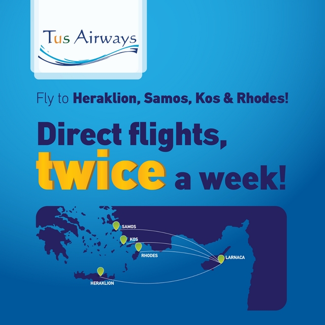 Με τιμές που από 59 ευρώ ξεκινάει την σύνδεση της Λάρνακας με Ηράκλειο, Σάμο, Κω και Ρόδο η Tus Airlines τις επόμενες εβδομάδες. Στην πρόθεση της εταιρείας, η οποία πετάει και προς Τελ Αβιβ, είναι η σύνδεση με Κάρπαθο. Προς το παρόν η διοίκηση της Tus δεν έχει ξεκαθαρίσει εάν θα υπάρχει σύνδεση μεταξύ κυπριακού αεροδρομίου με Αθήνα ή Θεσσαλονίκη.