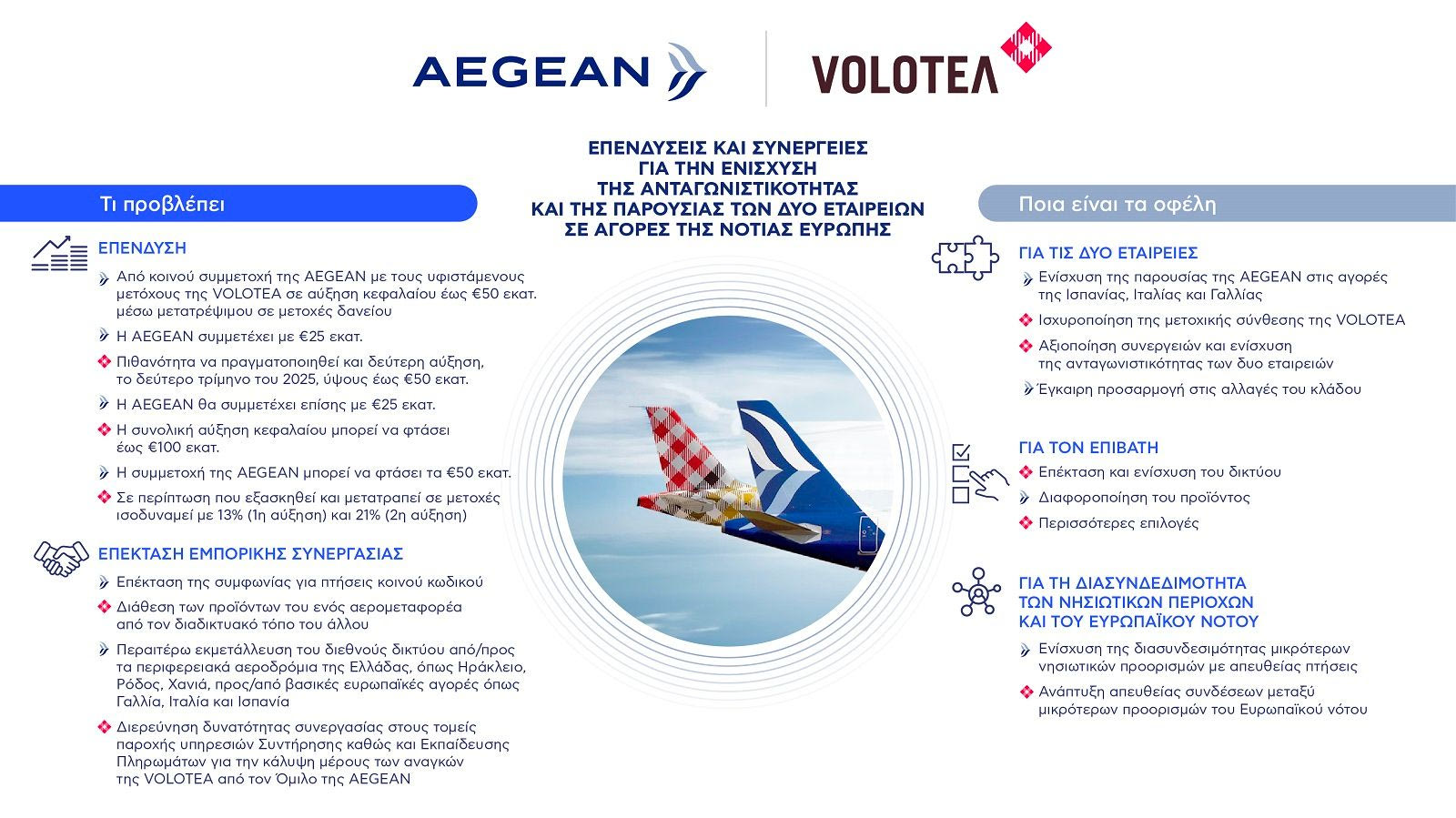 Η συμφωνία μεταξύ AEGEAN και Volotea περιλαμβάνει την άμεση συμμετοχή της AEGEAN σε αύξηση κεφαλαίου της Volotea ύψους 25 εκατ. ευρώ, με προοπτική έως 50 εκατ. ευρώ, μέσω μετατρέψιμου δανείου. Σε περίπτωση που μετατραπεί σε μετοχές, η πρώτη δόση ισοδυναμεί για την AEGEAN σε ποσοστό 13% στη Volotea ενώ σε περίπτωση που τεθεί σε εφαρμογή και το 2ο σκέλος της συμφωνίας το ποσοστό μπορεί να ανέλθει σε 21%.  Η Volotea, ιδρυμένη το 2011, έχει αναπτυχθεί σημαντικά, προσφέροντας σχεδόν 450 δρομολόγια φέτος και επιδιώκοντας να ενισχύσει την παρουσία της στις αγορές της Νότιας Ευρώπης.