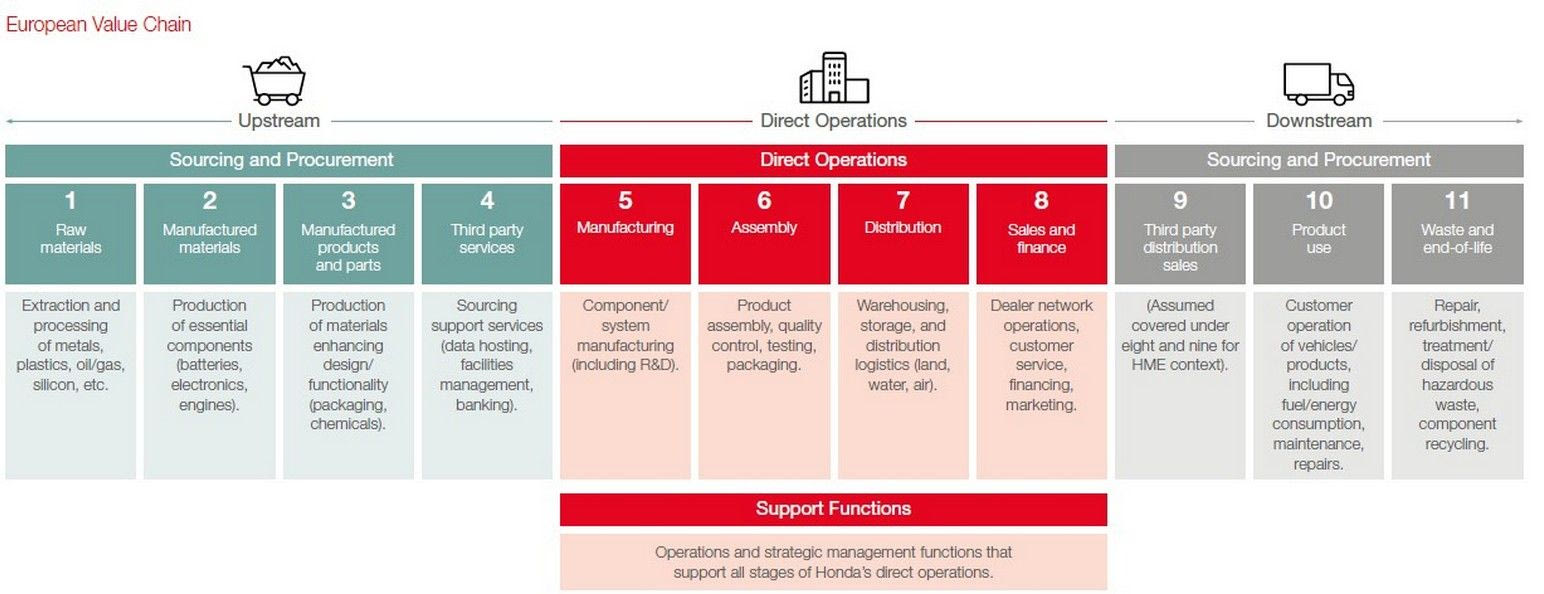 Κατά την περίοδο αναφοράς, η Honda ολοκλήρωσε Διπλή Ανάλυση Ουσιαστικότητας (DMA) για το σύνολο των περιφερειακών της δραστηριοτήτων, των προϊόντων και της αλυσίδας αξίας. Τα αποτελέσματα της ανάλυσης αναμένεται να επηρεάσουν τον στρατηγικό σχεδιασμό, τον καθορισμό στόχων και τη διαχείριση κινδύνων της εταιρείας τα επόμενα έτη.
