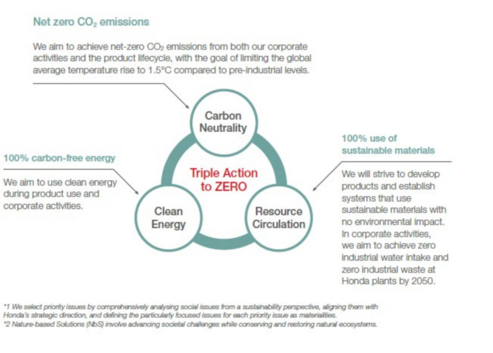 Όπως αναφέρει η διοίκηση της εταιρείας η Έκθεση Βιωσιμότητας λειτουργεί ως εργαλείο παρακολούθησης της προόδου της Honda Motor Europe σε σχέση με τον μακροπρόθεσμο στόχο της μητρικής εταιρείας για κλιματική ουδετερότητα σε όλα τα προϊόντα και τις εταιρικές δραστηριότητες έως το 2050, στο πλαίσιο της στρατηγικής «Triple Action to Zero».