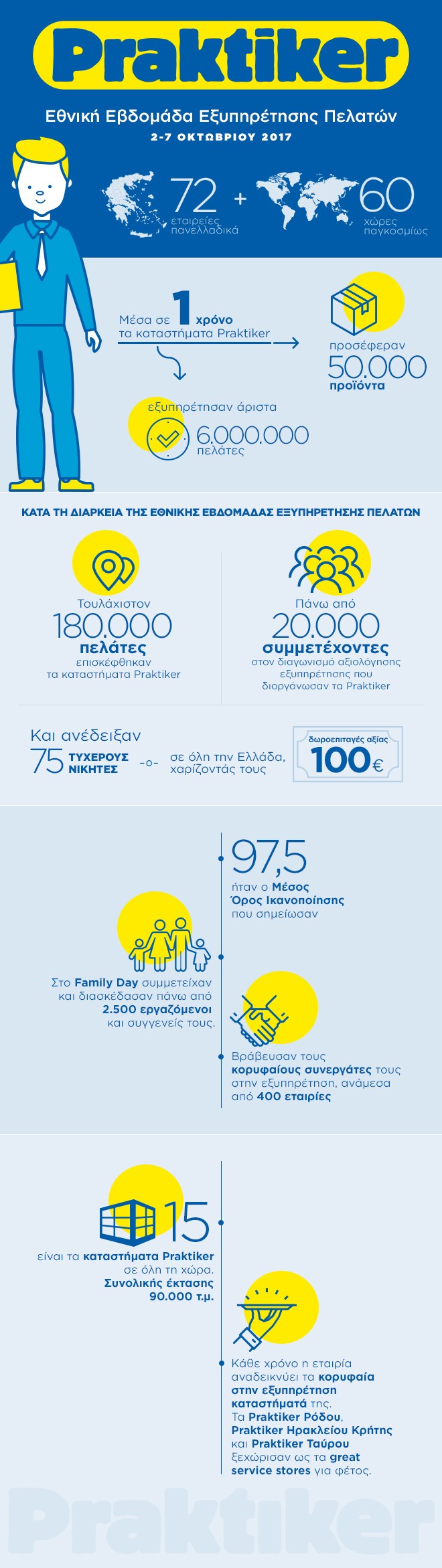 Η ελληνική εταιρεία που ξεχώρισε ήταν τα Praktiker, καθώς τουλάχιστον 180.000 πελάτες επισκέφθηκαν τα καταστήματα Praktiker και έζησαν μια μοναδική εμπειρία, με δημιουργικά σεμινάρια, επιδείξεις, δωρεάν μεταφορά & ειδικές τιμές σε τεχνικές υπηρεσίες, διαγωνισμούς και πολλές προσφορές και εκπλήξεις. Παράλληλα, πάνω από 20.000 ήταν οι συμμετέχοντες στον διαγωνισμό αξιολόγησης εξυπηρέτησης που διοργάνωσαν τα Praktiker, ο οποίος ανέδειξε 75 τυχερούς νικητές σε όλη την Ελλάδα, χαρίζοντάς τους δωροεπιταγές αξίας 100 ευρώ. Συνολικά, η Praktiker Hellas κατά την εβδομάδα 2-7 Οκτωβρίου 2017, σημείωσε Μέσο Όρο Ικανοποίησης που άγγιξε το 97,5%! Παράλληλα, στο πλαίσιο του θεσμού, η Praktiker Hellas διοργάνωσε για τους εργαζομένους της μια σειρά από διασκεδαστικές δράσεις, γεμάτες όμορφες εκπλήξεις. Μάλιστα, η εβδομάδα ολοκληρώθηκε για εκείνους μοναδικά, αφού είχαν την ευκαιρία να υποδεχθούν τα αγαπημένα τους πρόσωπα στον χώρο εργασίας τους σε μια αξέχαστη, διαδραστική γιορτή, με πλούσια δώρα, το ‘ Family Day’, όπου συμμετείχαν και διασκέδασαν πάνω από 2.500 εργαζόμενοι και συγγενείς τους! Σκοπός της εταιρίας, άλλωστε, είναι οι άνθρωποί της να αισθάνονται πιο περήφανοι κάθε μέρα που αποτελούν μέλη της οικογένειας της Praktiker Hellas και μιας ομάδας που διαρκώς προχωρά και εξελίσσεται.