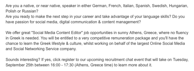 Ήδη από τον προηγούμενο μήνα σε διεθνείς ιστότοπους εύρεσης εργασίας είχε αναρτηθεί αγγελία η οποία ενημέρωνε όσους έχουν μητρική γλώσσα ή μιλούν άψογα τα γερμανικά, γαλλικά, ιταλικά, ισπανικά, σουηδικά, ουγγρικά, πολωνικά ή ρώσικα για ευκαιρία εργασίας ως “Social Media Content Editor” στην ηλιόλουστη Αθήνα για λογαριασμό του μεγαλύτερου online κοινωνικού δικτύου.