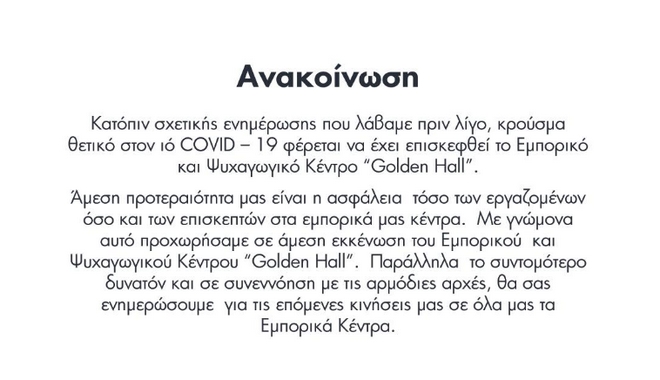 “Κατόπιν σχετικής ενημέρωσης που λάβαμε πριν λίγο, κρούσμα θετιό στον ιό COVID-19 φέρεται να έχει επισκεφθεί το Εμπορικό και Ψυχαγωγικό Κέντρο “Golden Hall”. Άμεση προτεραιότητά μας είναι η ασφάλεια τόσο των εργαζομένων όσο και των επισκεπτών στα εμπορικά μας κέντρα.Με γνώμονα αυτό προχωρήσαμε σε άμεση εκκένωση του Εμπορικού και Ψυχαγωγικού Κέντρου “Golden Hall”. Παράλληλα, το συντομότερο δυνατόν και σε συνεννόηση με τις αρμόδιες αρχές, θα σας ενημερώσουμε για τις επόμενες κινήσεις μας σε όλα μας τα Εμπορικά Κέντρα”.