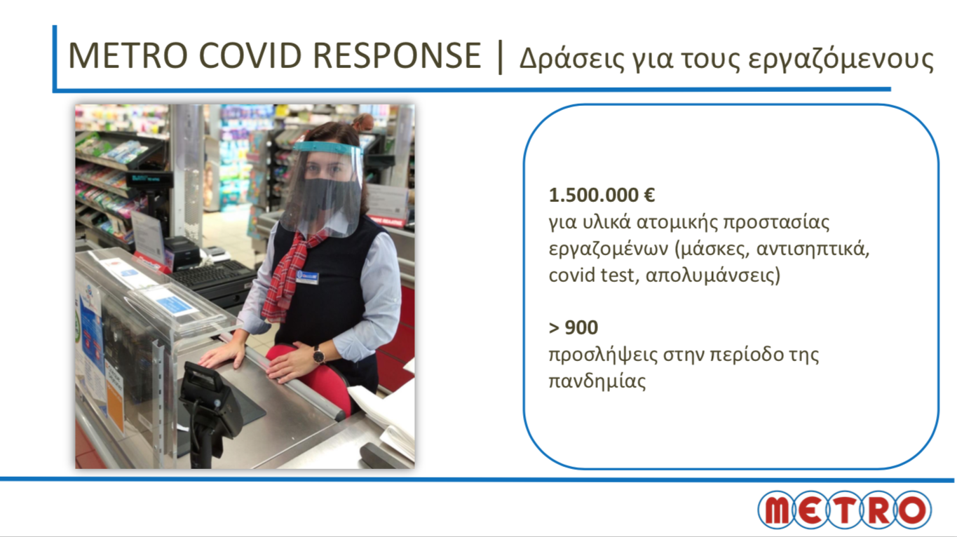 Μέχρι σήμερα ο όμιλος έχει δαπανήσει περίπου 1,5 εκατ. ευρώ για την προστασία από τον κορονοϊό (μάσκες, αντισηπτικά, πλέξιγκλας τεστ κ.α.) ενώ υπήρξαν και 900 προσλήψεις για να καλύψουν τόσο τις αυξημένες ανάγκες που δημιουργήθηκαν όσο και τα κενά που δημιουργήθηκαν από έκτακτες καταστάσεις όπως ήταν οι άδειες ειδικού σκοπού.
