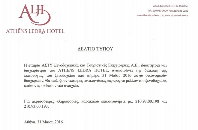 “Η εταιρεία ΑΣΤΥ Ξενοδοχειακές και Τουριστικές Επιχειρήσεις Α.Ε., ιδιοκτήτρια και διαχειρίστρια του ATHENS LEDRA HOTEL, ανακοινώνει τη διακοπή της λειτουργίας του ξενοδοχείου από σήμερα, 31 Μαΐου 2016, λόγω οικονομικών δυσχερειών. Θα υπάρξουν νεότερες ανακοινώσεις ως προς το μέλλον του ξενοδοχείου, εφόσον προκύψουν νέα στοιχεία”, αναφέρεται στην ανακοίνωση της εταιρείας.