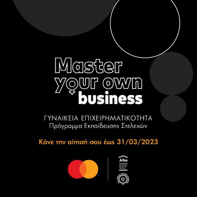Οι γυναίκες επιχειρηματίες συνεισφέρουν πάνω από 3 τρισεκατομμύρια δολάρια στη σημερινή οικονομία, ενώ σύμφωνα με το Mastercard Index Of Women Entrepreneurs 2022, η στήριξη ακόμα περισσότερων γυναικών επιχειρηματιών, θα μπορούσε να αυξήσει άμεσα την παγκόσμια οικονομική παραγωγή έως και 5 τρισεκατομμύρια δολάρια. Η Mastercard, στο πλαίσιο της νέας σειράς δράσεων για το 2023 με στόχο την επαγγελματική ενδυνάμωση των γυναικών, διευρύνει τις πρωτοβουλίες της και στέκεται δίπλα σε κάθε γυναίκα επιχειρηματία που τη χρειάζεται, επενδύοντας στην εκπαίδευσή της, μέσα από το νέο Πρόγραμμα Εκπαίδευσης Στελεχών «Master your Own Business», σε συνεργασία με το Executive Development του Alba Graduate Business School, The American College of Greece.