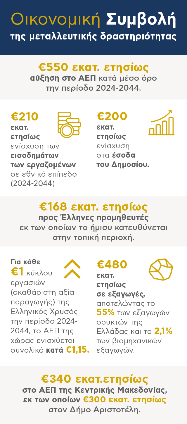 Σύμφωνα με τη μελέτη, την περίοδο 2024-2044, η επένδυση της Ελληνικός Χρυσός αναμένεται να συνεισφέρει κατά μέσο όρο 550 εκατ. ευρώ ετησίως στο ΑΕΠ της χώρας, αποδεικνύοντας πώς ο ορυκτός πλούτος μπορεί να συμβάλει καθοριστικά στην ενίσχυση της εθνικής οικονομίας. Η δραστηριότητα της εταιρείας ενισχύει αποφασιστικά και την τοπική οικονομία της Κεντρικής Μακεδονίας, η οποία, ωφελείται ετησίως κατά 340 εκατ. ευρώ, εκ των οποίων περισσότερα από 300 εκατ. ευρώ αφορούν άμεσα τον Δήμο Αριστοτέλη.