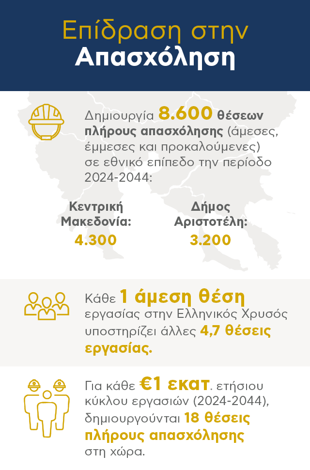 Η συνεισφορά της εταιρείας στην απασχόληση είναι εξίσου καθοριστική. Σύμφωνα με τα στοιχεία της μελέτης, την περίοδο 2024-2044, η επένδυση αναμένεται να δημιουργήσει 8.600 θέσεις πλήρους απασχόλησης (άμεσες, έμμεσες και προκαλούμενες), ενώ για κάθε μία άμεση θέση στην Ελληνικός Χρυσός, δημιουργούνται άλλες 4,7 θέσεις εργασίας στην οικονομία – μια ισχυρή πολλαπλασιαστική επίδραση που στηρίζει την τοπική κοινότητα.