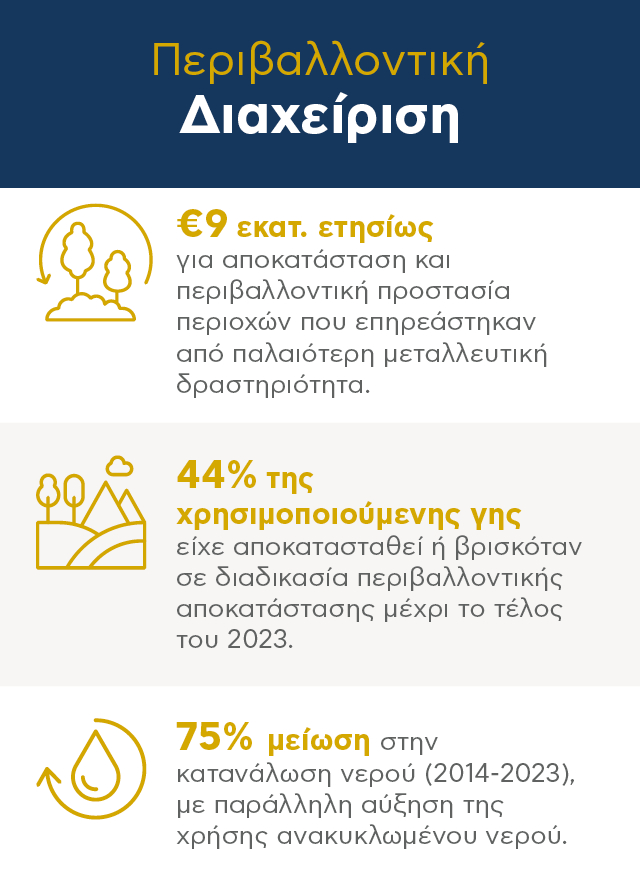 Η περιβαλλοντική διάσταση της δραστηριότητας καταγράφει επίσης θετικές επιδόσεις. Μέχρι το 2023, η εταιρεία έχει αποκαταστήσει το 44% της χρησιμοποιούμενης γης, ενώ έχει πετύχει μείωση της κατανάλωσης νερού κατά 75% από το 2014, παράλληλα με σημαντική αύξηση στη χρήση ανακυκλωμένου νερού.