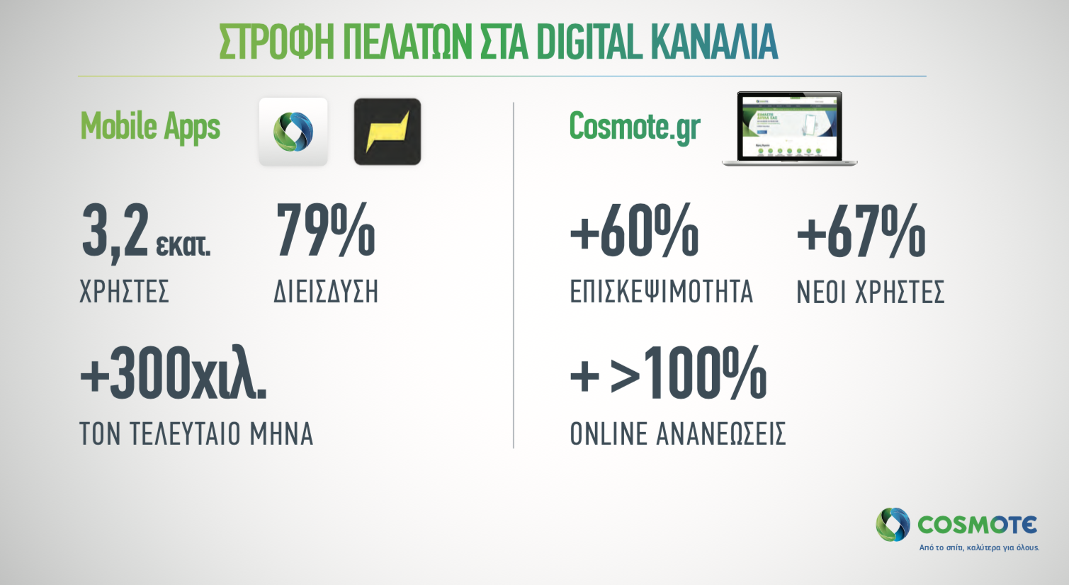 Ο Πρόεδρος του Ομίλου ΟΤΕ τοποθετήθηκε και για την επίδραση της κατάστασης στην οικονομική δραστηριότητα. «Προφανώς, επιπτώσεις υπάρχουν για όλες τις επιχειρήσεις και για τη χώρα στο σύνολό της. Το βλέπουμε και στον ΟΤΕ», είπε, και τόνισε ότι η εταιρεία προσπαθεί να περιορίσει τις απώλειες, αξιοποιώντας τις digital επιλογές που διαθέτει στον πελάτη για πληρωμές λογαριασμών και για αγορές προϊόντων και υπηρεσιών, όπως το COSMOTE app, το site και τα e-shop. Όπως ανέφερε: «Το app, το έχουν κατεβάσει τον τελευταίο μήνα 300.000 πελάτες. Συνολικά το χρησιμοποιούν πλέον 3,2 εκατ. συνδρομητές μας! Το νούμερο είναι εντυπωσιακό και αποδεικνύει πόσο σωστή ήταν η επιλογή μας να επενδύσουμε σε αυτό εδώ και δύο χρόνια».