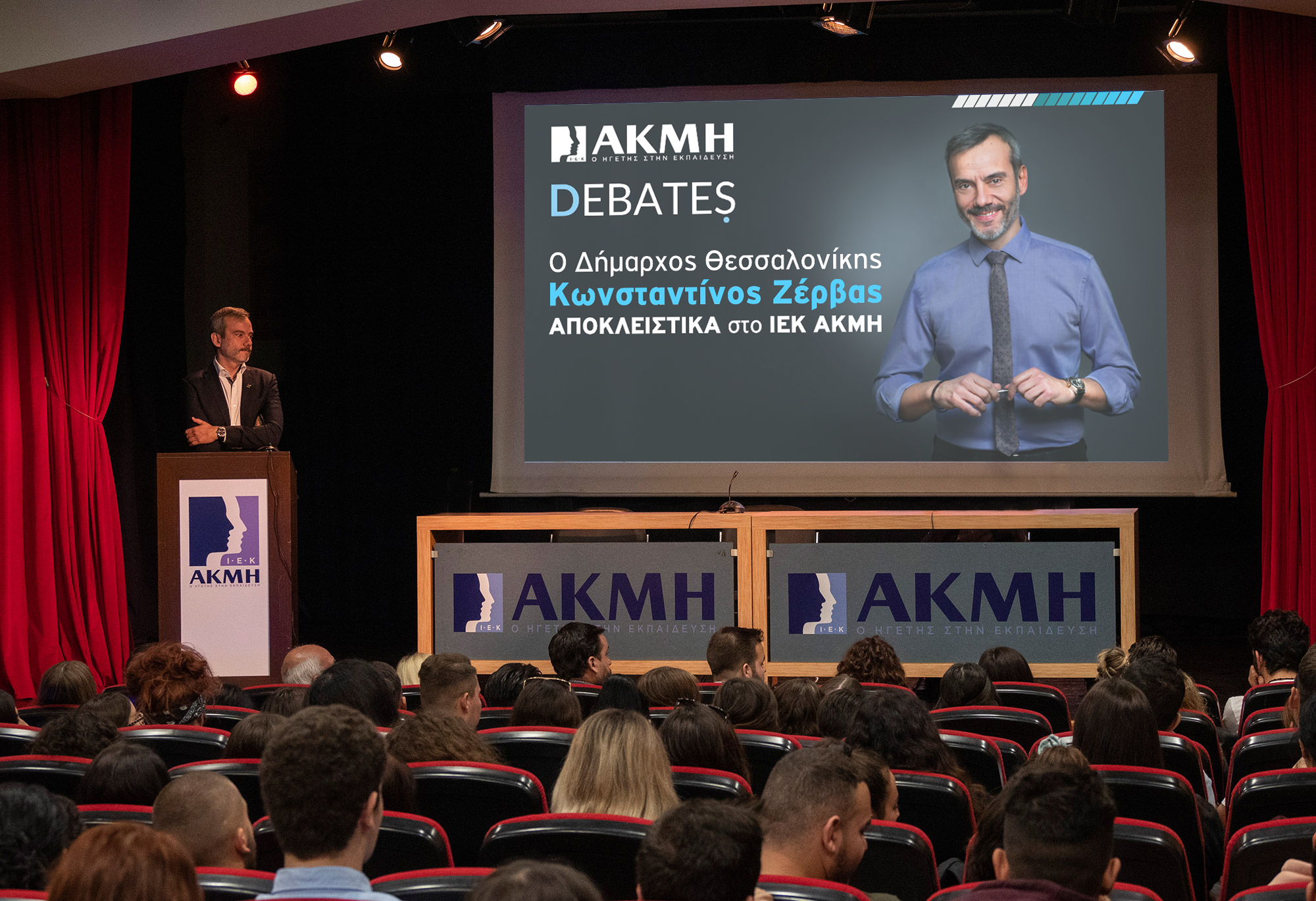 Με μεγάλη επιτυχία πραγματοποιήθηκε το πρώτο session του πρωτοποριακού θεσμού DEBATES από το ΙΕΚ ΑΚΜΗ στη Θεσσαλονίκη με καλεσμένο τον νεοεκλεγέντα Δήμαρχο κ. Κωνσταντίνο Ζέρβα στο κατάμεστο από σπουδαστές Αμφιθέατρο «Μέγας Αλέξανδρος».