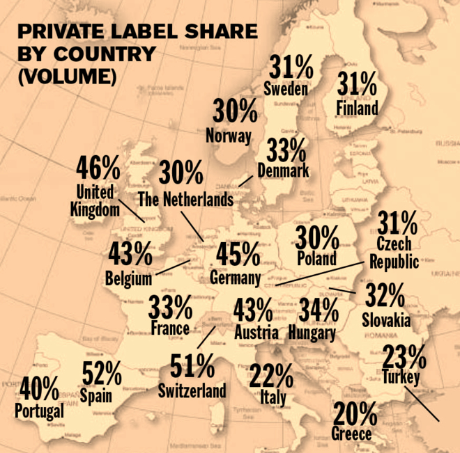 Τα private label, δηλαδή τα προϊόντα που φέρουν την επωνυμία του σούπερ μάρκετ, κερδίζουν συνεχώς έδαφος στην Ευρώπη και αυτό είναι λογικό καθώς αλυσίδες όπως η Lidl και η Aldi επεκτείνονται αλλά και οι υπόλοιποι παίκτες αυξάνουν την γκάμα των προϊόντων με το σήμα τους.