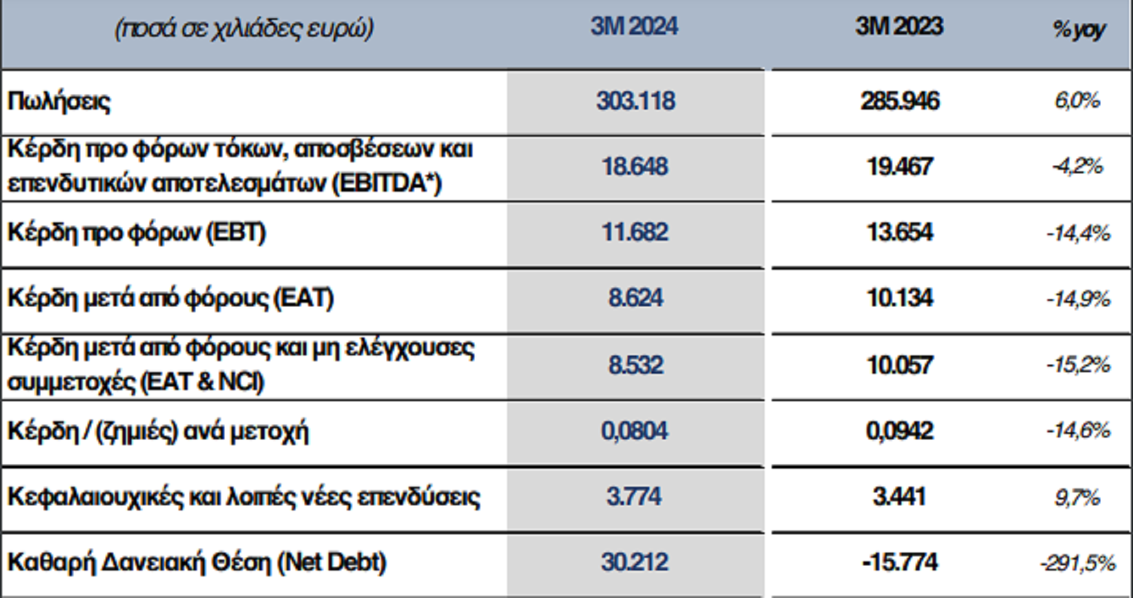 Σε σύγκριση με το αντίστοιχο τρίμηνο του 2023, οι πωλήσεις σημείωσαν αύξηση 6%, ενώ μειώθηκαν, η λειτουργική κερδοφορία (EBITDA) κατά -4,2% τα κέρδη προ φόρων (ΕΒΤ) κατά -14,4% καιτα καθαρά κέρδη (ΕAΤ) κατά -14,9%. Η μείωση των κερδών προ φόρων οφείλεται κυρίως στη μείωση των μικτών περιθωρίων στις εμπορικές δραστηριότητες και στη μεγέθυνση του καθαρού χρηματοοικονομικού κόστους λόγω της αύξησης του επιτοκίουβάσης (Euribor) και του δανεισμού.