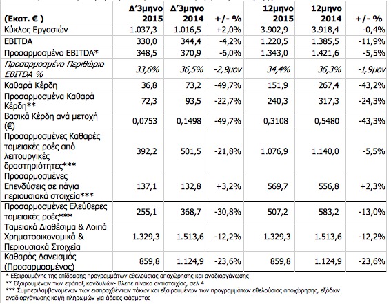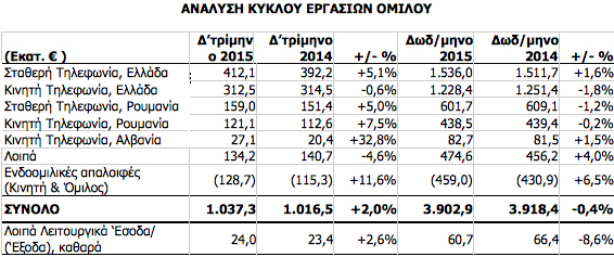 Ο ΟΤΕ ανακοίνωσε το πρωί της Πέμπτης τα οικονομικά μεγέθη του ομίλου τόσο για το δ τετράμηνο του 2015 όσο και για το σύνολο της χρονιάς. Αναλυτικά, τα οικονομικά μεγέθη του ομίλου, με βάση τα Διεθνή Πρότυπα Χρηματοοικονομικής Αναφοράς διαμορφώθηκαν ως εξής: