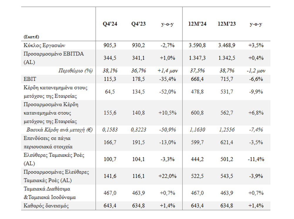 Πιο αναλυτικά, σύμφωνα με την ανακοίνωση των οικονομικών αποτελεσμάτων της εταιρείας, σε επίπεδο Ομίλου, τα ενοποιημένα έσοδα το Δ’ τρίμηνο του 2024 μειώθηκαν κατά 2,7% και διαμορφώθηκαν σε