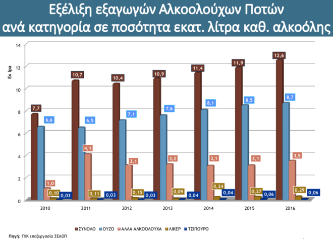 Πρωταγωνιστής σε αυτή την εξωστρεφή προσπάθεια είναι το ούζο το οποίο καλύπτει σχεδόν το 70% των ελληνικών εξαγωγών σε ποτά. Αντίστοιχα το τσίπουρο περιορίζεται σε μόλις 0,45%. Σε ότι αφορά στους όγκους από τα 7,7 εκατ. λίτρα καθαρής αλκοόλης του ούζου που εξήχθησαν το 2010 το 2016 φθάσαμε στα 12,6 εκατ. λίτρα.