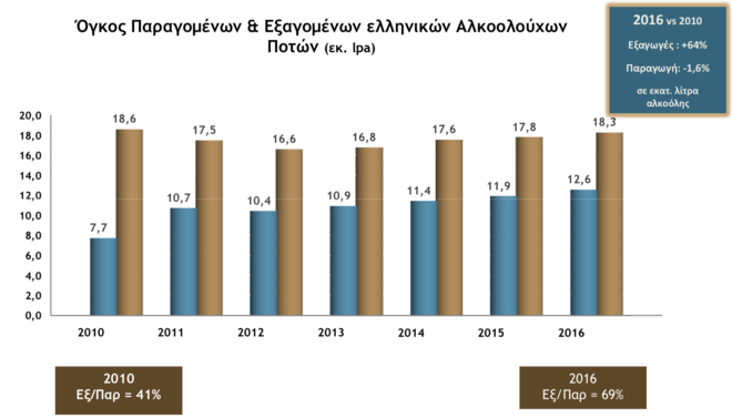 Σύμφωνα με τα στοιχεία που παρουσίασε ο Πρόεδρος του ΣΕΑΟΠ, κ. Νίκος Καλογιάννης η σωτηρία του κλάδου από αυτή την κατακόρυφη πτώση προήλθε κυρίως από την προσπάθεια εξωστρέφιας του. Έτσι ενώ η συνολική παραγωγή ποτών στην Ελλάδα μειώθηκε κατά 1,6% οι εξαγωγές εκτοξεύθηκαν κατά 64% μειώνοντας το εμπορικό έλλειμμα του κλάδου από 152 εκατ. ευρώ το 2010 σε 79 εκατ. ευρώ το 2017.