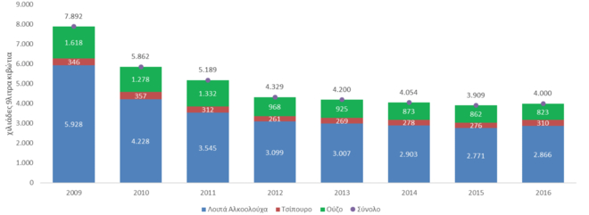 Στα χρόνια της ύφεσης η εγχώρια κατανάλωση ούζου ήταν κατακόρυφη. Σύμφωνα με την μελέτη του ΙΟΒΕ η πτώση ήταν της τάξης του 50% καθώς η κατανάλωση περιορίστηκε 823 χιλ. 9λιτρα κιβώτια, έναντι 1.618 το 2009. Αντίθετα το επίσημα διακινούμενο τσίπουρο, που είναι και το πλέον ανερχόμενο ποτό της τελευταίας δεκαετία, παρουσιάσε ελάχιστη μεταβολή ενώ εκτοξεύθηκε η κατανάλωση του μη ελεγχόμενου στην διακίνηση τσίπουρου.