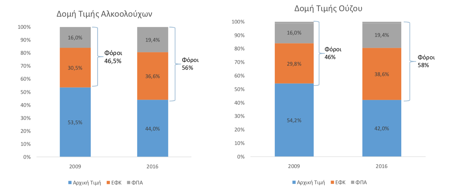 Ας τα πάρουμε όμως τα πράγματα από την αρχή. Στα χρόνια της ύφεσης το ούζο, ένα καθα΄ρα ελληνικό προιόν που σε μεγάλο βαθμό παράγεται στην δοκιμαζόμενη Λέσβο, όσο και αν φαίνεται παράδοξο φορολογήθηκε περισσότερο από ότι τα υπόλοιπα ποτά που παράγονται ή εισάγονται στην χώρα. Όπως φαίνεται και στον παρακάτω πίνανκα που παρουσιάστηκε την Δευτέρα σε εκδήλωση του Συνδέσμου Ελλήνων Παραγωγών Αποσταγμάτων Αλκοολούχων Ποτών (ΣΕΑΟΠ,) από 46% που ήταν οι φόροι που βάρυναν μίας φιάλης στην αρχή της ύφεσης, το 2016 είχαν φθάσει σε 58%.