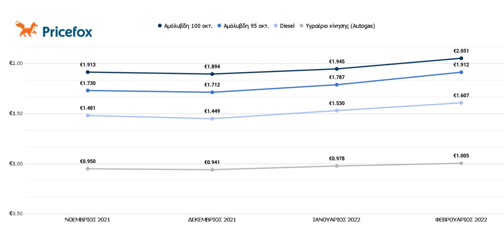 Σύμφωνα με το παρακάτω γράφημα, οι τιμές του πετρελαίου για τους οδηγούς που χρησιμοποιούν πετρελαιοκίνητα αυτοκίνητα, αυξήθηκαν μέσα στους πρώτους έξι μήνες του 2020, φτάνοντας τον Δεκέμβριο του 2020 στο 1,136€/λίτρο. Οι τιμές εκτοξεύτηκαν το Δεκέμβριο του 2021 προς το 1,449€/λίτρο και μέσα σε μόλις δύο μήνες είδαμε επιπλέον αύξηση με αποτέλεσμα η μέση τιμή στον μήνα που διανύουμε να διαμορφώνεται στο 1,607€/λίτρο.