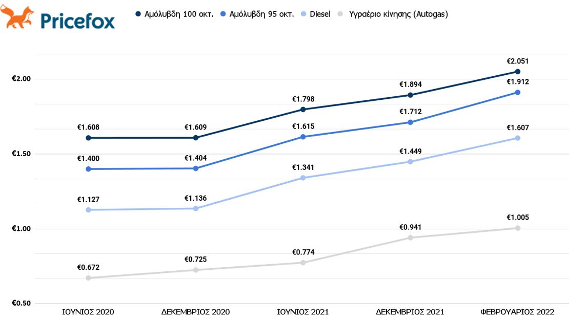 Σύμφωνα με τα στοιχεία του Υπουργείου ανάπτυξης και Ανταγωνιστικότητας, φαίνεται πως το Δεκέμβριο του 2020 οι τιμές της απλής βενζίνης άγγιζαν το 1,404€/λίτρο ενώ η χρονιά του 2021 έκλεισε με τους οδηγούς να πληρώνουν για απλή αμόλυβδη 1,712€/λίτρο. Η έκρηξη τιμών ήρθε τον Φεβρουάριο του 2022 με τους οδηγούς να έρχονται αντιμέτωποι στα πρατήρια καυσίμων με τιμές που εκτοξεύτηκαν στο 1,912€/λίτρο.