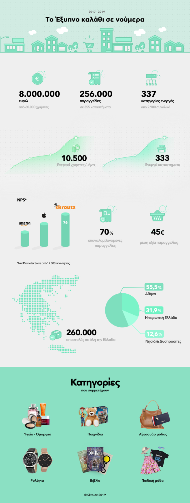 - Στο διάστημα αυτό η ομάδα του Skroutz έχει διαχειριστεί πάνω από 260.000 παραγγελίες, με το γεωγραφικό καταμερισμό των παραγγελιών να είναι ως εξής: 55,5% στην Αθήνα, 31,9% στην Ηπειρωτική Ελλάδα και 12,6% στα νησιά και τις δυσπρόσιτες περιοχές.