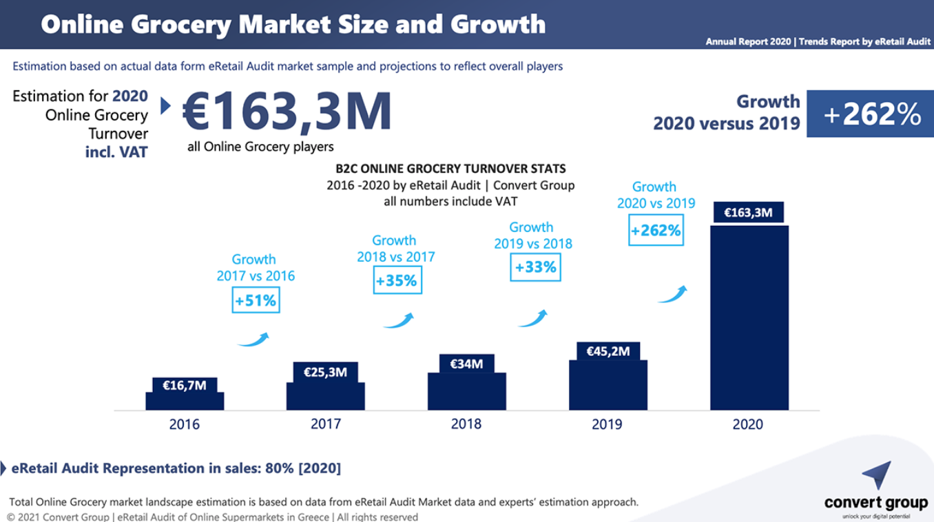 Ξεπέρασε κάθε πρόβλεψη ο ετήσιος ρυθμός ανάπτυξης του Online σούπερ μάρκετ στη χώρα μας, καθώς το 2020 κατέγραψε αύξηση 262% και έφτασε τα 163 εκατ. ευρώ σε τιμές λιανικής με το ΦΠΑ. Τα νούμερα αυτά δημοσιεύτηκαν την Δευτέρα στο ετήσιο report της Convert Group, της καινοτόμου Ελληνικής εταιρείας που καθοδηγεί παγκοσμίως τον κλάδο μετρήσεων για καταναλωτικά αγαθά και φάρμακα που πωλούνται οnline. Τα στελέχη της εταιρείας δηλώνουν εντυπωσιασμένα από τον ασυγκράτητο ρυθμό ανάπτυξης του καναλιού, καθότι τον Ιούλιο του 2020 είχαν κάνει πρόβλεψη για 100 εκατ. ευρώ ετήσιο τζίρο στο κλάδο του ηλεκτρονικού λιανεμπορίου.