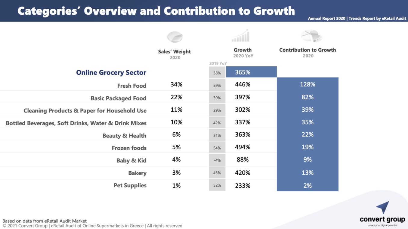 Μελετώντας όλες τις κατηγορίες που αυξήθηκαν σε αξία online αγορών το 2020, παρατηρούμε τις παρακάτω μεταβολές σε σχέση με το 2019: +494% σε κατεψυγμένα τρόφιμα, +446% σε φρέσκα τρόφιμα, +420% σε προϊόντα αρτοποιίας, +397% σε συσκευασμένα τρόφιμα, +363% σε καλλυντικά και είδη περιποίησης, +337% σε ποτά και αναψυκτικά, +302% σε χαρτικά και είδη καθαρισμού, +233% σε προϊόντα για κατοικίδια και +88% σε προϊόντα περιποίησης για παιδιά.