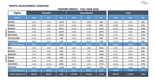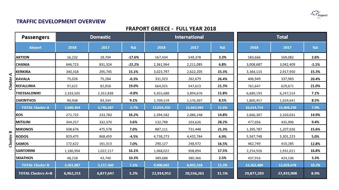 Σύμφωνα με τα στοιχεία της Fraport Greece, που διαχειρίζεται και ανακατασκευάζει τα συγκεκριμένα αεροδρόμια, η επιβατική κίνηση κατέγραψε αύξηση 8,9%, σε σχέση με το 2017, με 29.877.203 ταξιδιώτες. Από αυτούς, οι 22.914.952 είναι ταξιδιώτες από το εξωτερικό, με αύξηση 11,5%, και οι υπόλοιποι ταξιδιώτες εσωτερικού, με την αύξηση να είναι μόλις 1,2%.