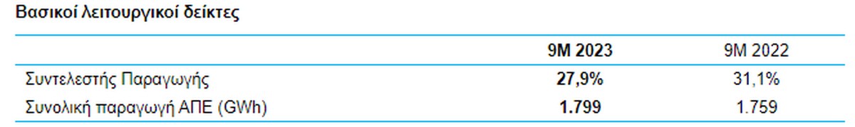 Ως προς τις ανεμολογικές συνθήκες, μετά από μια αδύναμη απόδοση κατά τους πρώτους 7 μήνες του έτους, η εικόνα ομαλοποιήθηκε τον Αύγουστο και τον Σεπτέμβριο, οι οποίοι κινήθηκαν στα συνήθη φυσιολογικά επίπεδα. Πιο συγκεκριμένα, ο συντελεστής φόρτισης κατά το 3ο τρίμηνο ανήλθε σε 29,6% έναντι 29,2% κατά το αντίστοιχο τρίμηνο του 2022.