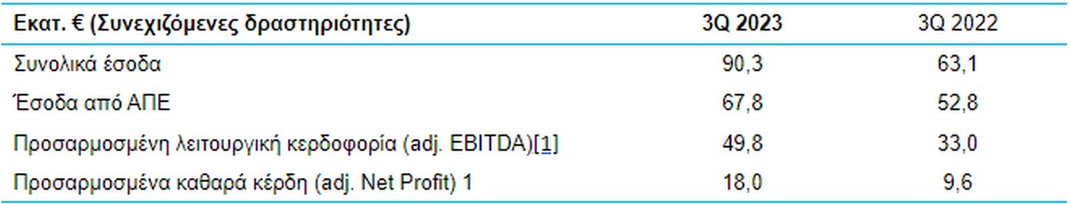 Σε επίπεδο κερδοφορίας από συνεχιζόμενες δραστηριότητες, η προσαρμοσμένη λειτουργική κερδοφορία (EBITDA) 1 για το 3ο τρίμηνο του έτους διαμορφώθηκε σε 49,8 εκατ. ευρώ έναντι 33,0 εκατ. ευρώ την αντίστοιχη περίοδο του προηγούμενου έτους. Αντίστοιχα, τα προσαρμοσμένα καθαρά κέρδη για το 3ο τρίμηνο του 2023 ανήλθαν σε 18,0 εκατ. ευρώ έναντι 9,6 εκατ. ευρώ για το τρίτο τρίμηνο του 2022.