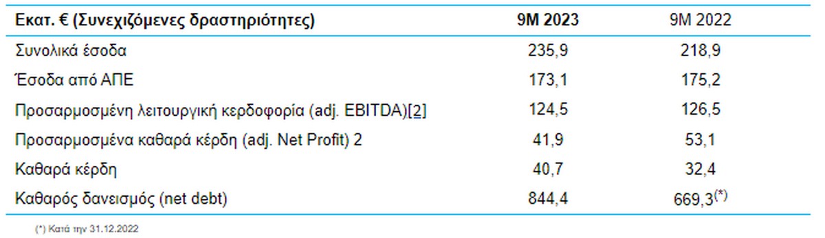 Σε προσαρμοσμένη βάση2 τα καθαρά κέρδη από συνεχιζόμενες δραστηριότητες διαμορφώθηκαν σε 41,9 εκατ. ευρώ έναντι 53,1 εκατ. για το Εννεάμηνο του 2022. Σημειώνεται ότι τα καθαρά κέρδη για το εννεάμηνο του 2023 έχουν επηρεαστεί από τις αυξημένες δαπάνες για χρηματοοικονομικά και αποσβέσεις σχετικά με το έργο του Καφηρέα, το οποίο έχει λειτουργήσει για ένα μικρό μόνο μέρος της περιόδου. Με την πλήρη λειτουργία του έργου και την άνοδο της λειτουργικής κερδοφορίας όπως προαναφέρθηκε, αναμένεται ενίσχυση και σε επίπεδο καθαρών κερδών.