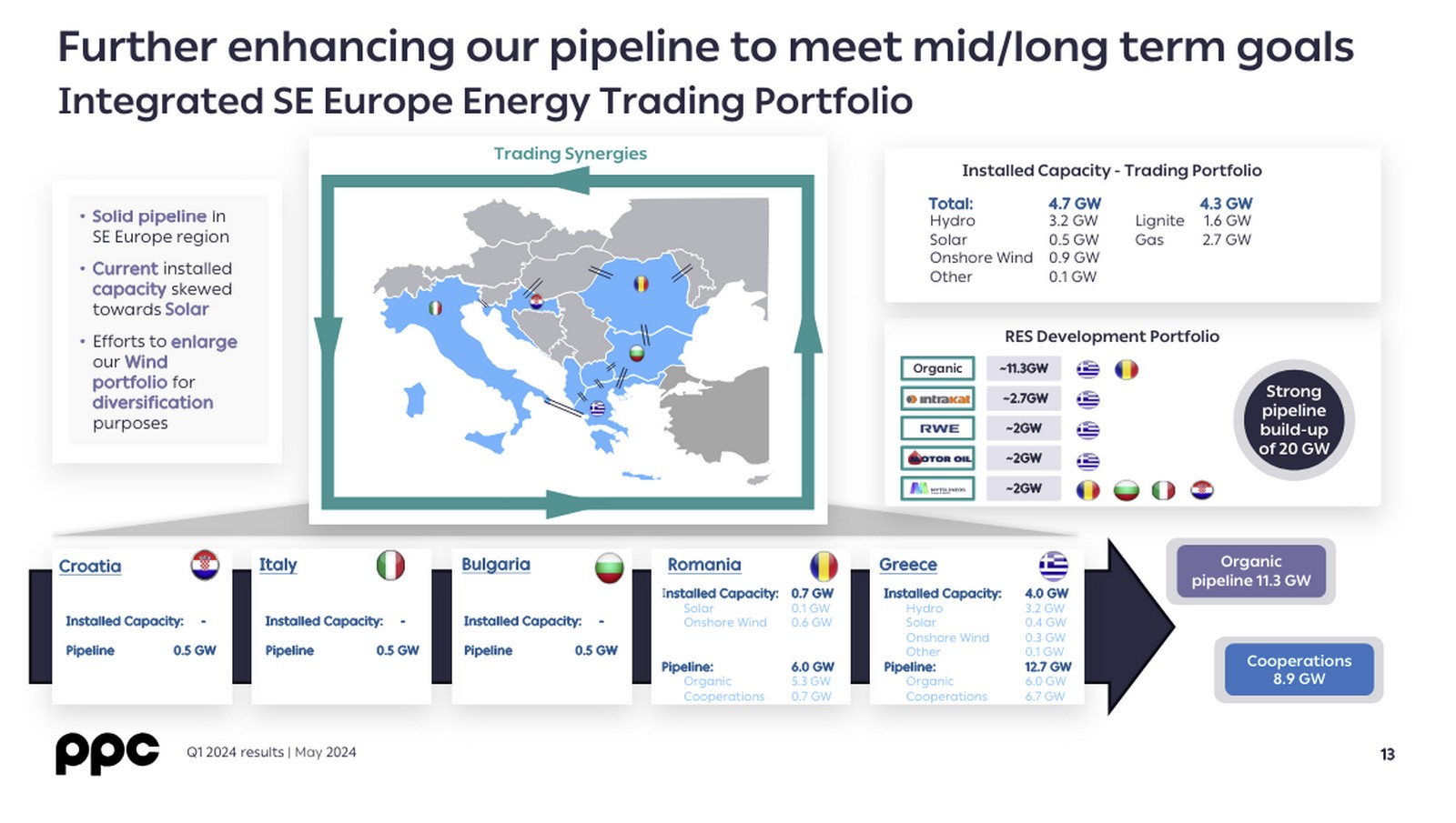 Ειδικότερα, όπως αποτυπώνεται και στην παρακάτω διαφάνεια από την παρουσίαση της Διοίκησης, η παραγωγική δραστηριότητα της ΔΕΗ διαμοιράζεται σε Ελλάδα, Βουλγαρία, Ρουμανία – μετά και την εξαγορά της θυγατρικής της Enel στη χώρα -, Ιταλία και Κροατία – σε συνέχεια του deal με την Mytilineos.