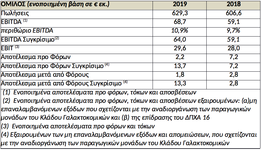 Τα δημοσιευμένα ενοποιημένα κέρδη EBITDA διαμορφώθηκαν σε €68,7 εκ. έναντι €59,1 εκ. το 2018 (+16%), με όλους τους Κλάδους να παρουσιάζουν αύξηση των λειτουργικών τους κερδών. Τα συγκρίσιμα κέρδη EBITDA, εξαιρουμένης της επίδρασης του ΔΠΧΑ 16, καθώς και των μη επαναλαμβανόμενων εξόδων, που σχετίζονται με τη λειτουργική αναδιάρθρωση του Κλάδου Γαλακτοκομικών, ανέρχονται σε €64 εκ. (+8% σε σχέση με το 2018). Οι Κλάδοι του Ομίλου διατήρησαν τις ηγετικές τους θέσεις στις αγορές που δραστηριοποιούνται, παρέχοντας στους καταναλωτές προϊόντα και υπηρεσίες υψηλής ποιότητας και προστιθέμενης αξίας.