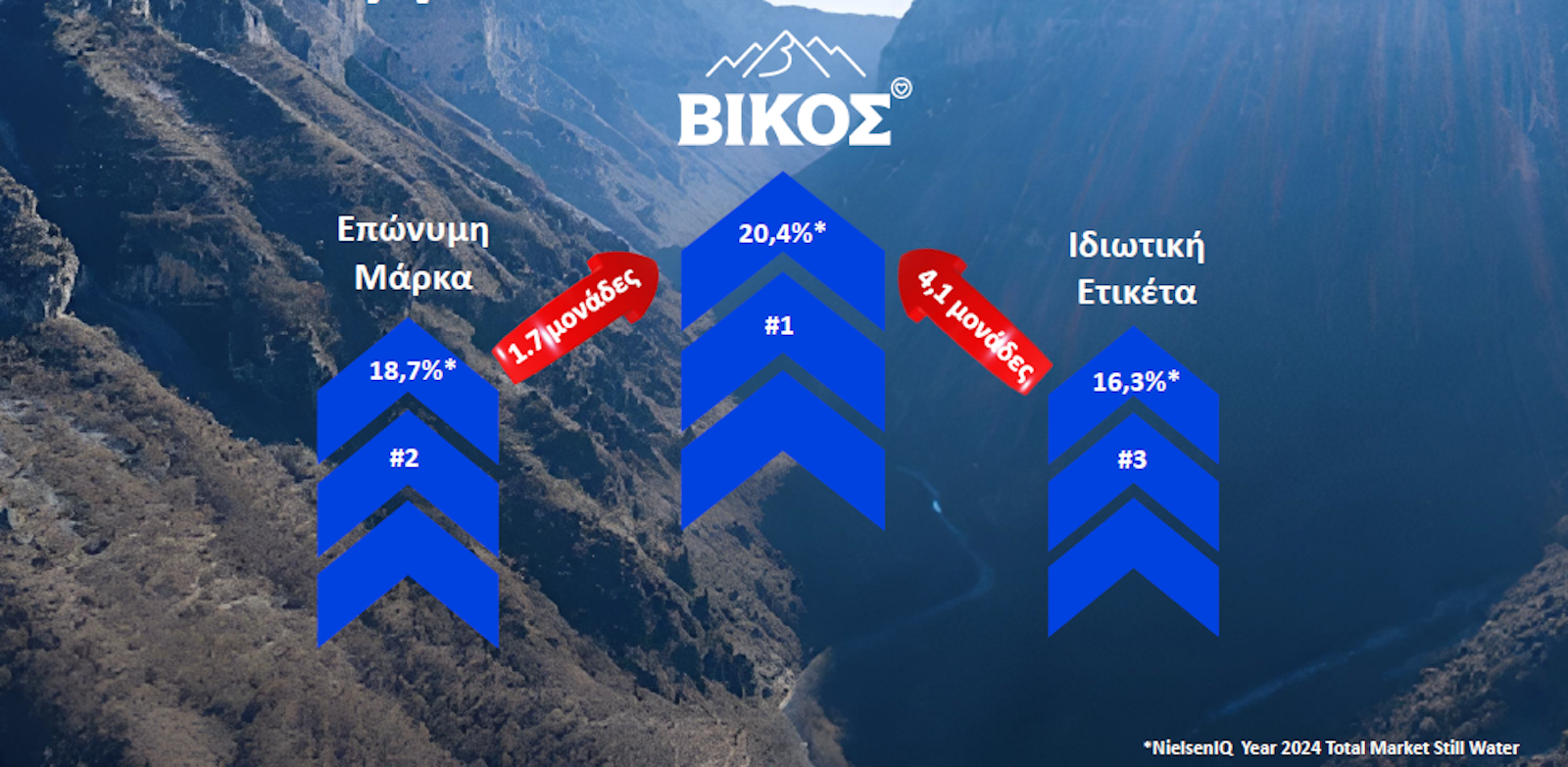 ’Ετσι, το Φυσικό Μεταλλικό Νερό Βίκος, κατέκτησε την πρώτη θέση με εντυπωσιακό μερίδιο αγοράς 20,4% το 2024, σύμφωνα με επίσημα στοιχεία της NielsenIQ, σε μια κατηγορία που γνώρισε ανάπτυξη 10,2%* με τον συνολικό όγκο της κατηγορίας να ανέρχεται σε 915.639.567 λίτρα το 2024, από 831.261.542 λίτρα το 2023, το Φυσικό Μεταλλικό Νερό Βίκος ξεχώρισε με εκρηκτική αύξηση 18,7%*; με τον όγκο του να αυξάνεται από 157.520.558 λίτρα το 2023 σε 187.019.709 λίτρα το 2024, αφήνοντας τον δεύτερο επώνυμο ανταγωνιστή πίσω κατά 1,7 μονάδες. Σημειώνεται ότι το 2024 τα προϊόντα ιδιωτικής ετικέτας, που στο παρελθόν είχαν “πάρει κεφάλι” αναπτύχθηκαν με πολύ χαμηλότερο ρυθμό σε σχέση με το σύνολο της αγοράς.