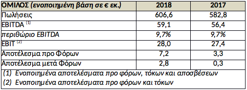 Τα ενοποιημένα κέρδη EBITDA ακολούθησαν την αυξητική τάση των πωλήσεων (+4,8%) και ανήλθαν σε €59,1 εκ. έναντι €56,4 εκ. το 2017.