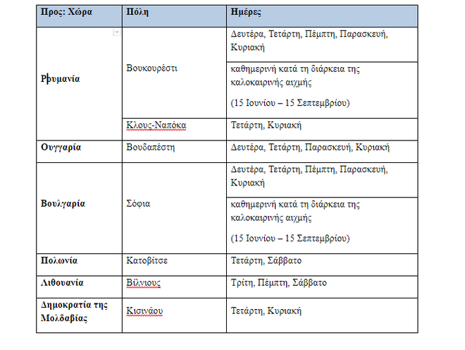 Σήμερα, πριν από λίγο, πραγματοποιήθηκε η πρώτη πτήση από το Βουκουρέστι προς την Αθήνα. Συνολικά, η εταιρεία θα συνδέει την πρωτεύουσα με 7 προορισμούς: Βίλνιους (Λιθουανία), Κατοβίτσε (Πολωνία), Βουδαπέστη (Ουγγαρία), Κισινάου (Μολδαβία), Κλουζ – Ναπόκα (Ρουμανία), Βουκουρέστι (Ρουμανία) και Σόφια (Βουλγαρία). Δύο ακόμη προορισμοί, το Λούτον / Λονδίνο θα προστεθεί τον Απρίλιο και το Κουτάισι τον Μάιο. Επίσης, η εταιρεία θα ξεκινήσει πτήσεις και από Θεσσαλονίκη, προς το Ιάσιο τον Ιούλιο και προς την Βιέννη τον Νοέμβριο. Οι τιμές των εισιτηρίων ξεκινούν από τα 14,99 ευρώ.